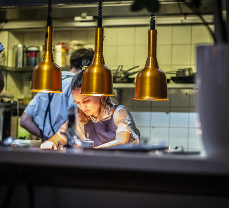 Caroline: “We bereiden zero-waste cocktails omdat we tegen verspilling zijn. Dit betekent dat alle ingrediënten die we in het keukenteam niet gebruiken, in artisanale spirits worden verwerkt. Alle groenten en kruiden komen rechtstreeks van Dries, onze biologische boer. Zo krijg je een circulair systeem in een korte keten. We werken met lokale designers en gebruiken Belgisch PEFC hout voor onze tafels en stoelen. Ons uniform van eco-jeans is ontworpen door Façon Jacmin, een Brussels modemerk. Alle aspecten van humus & hortense ademen duurzaamheid.”